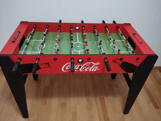 Futbolín con diseño de Coca-Cola, ideal para entretenimiento. - Estructura principal en color rojo. - Figuras de jugadores en blanco y negro. - Barras metálicas para los jugadores. - Barras telescópicas , que no sobresalen por el otro lado , para mayor seguridad. - Diseño exclusivo de Coca Cola.