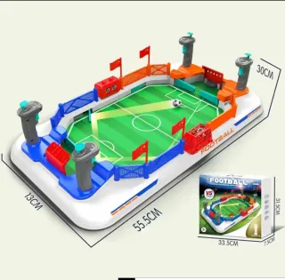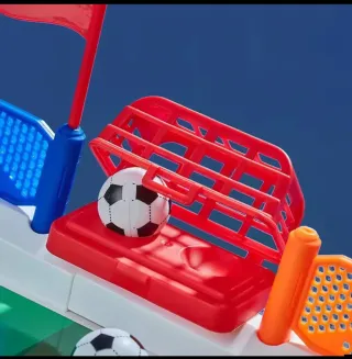 Divertido futbolín de mesa para jugar en casa. Ideal para pasar ratos de ocio. - Campo de juego verde con líneas blancas. - Banderines rojos y azules. - Marcador rojo con números. - Dos porterías rojas. - Dos torres grises con palancas.