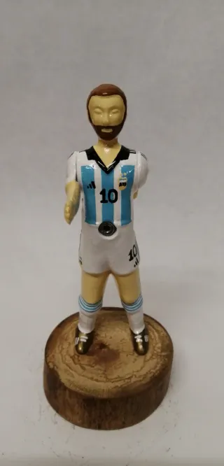 Muñeco de Futbolin Argentina Messi. Edición Leyendas. Muñeco nuevo del modelo Córdoba, pintado equipación de la selección de Argentina en el mundial de Qatar 2022, la del Mundial de Messi Personalizado con el número 10 y el brazalete de capitán de Messi. Pintado a mano con mucho detalle. Colocado en rodaja de madera de fresno barnizada. Va sujeto por lo que no se cae. Posibilidad de venderlo como colgador de muñeco o imán. Según le interese al cliente. Personalizamos cualquier jugador de tu equipo favorito. Envío a través de wallapop envíos.