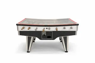 Futbolín de estilo profesional, listo para la acción. Ideal para entretenimiento en casa o locales. - Diseño robusto con acabado en blanco y detalles rojos. - Varillas metálicas con jugadores metalicos - Marcador de puntos integrado.