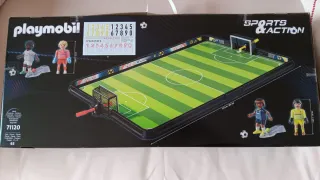Set de Playmobil Sports & Action con un campo de fútbol. Campo de fútbol, Futbolín para niños, 2 porteros, 2 futbolistas con función de Patada, 3 balones de futbolín, Juguetes para niños a Partir de 5 años Medida alto 70 cm Medida largo 10cm Medida ancho 30 cm
