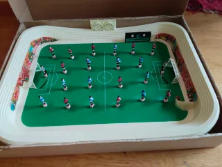 Futbolín de mesa de los años 80, en buen estado. Ideal para nostálgicos. - Medidas compactas, perfecto para espacios reducidos. - Diseño clásico con detalles de época. - Incluye todos los jugadores ,le falta el balon. El juego es el estadio con todos los jugadores,bandera y porterías.