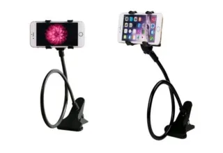 Soporte universal para teléfono móvil con brazo flexible y pinza. - Color negro. - Pinza de sujeción. - Brazo flexible para ajustar la posición.