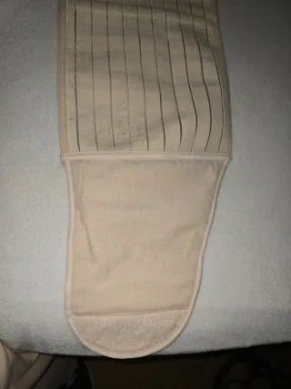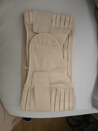 Faja lumbar de color beige, diseñada para ofrecer soporte y comodidad. - Fabricada en material elástico y transpirable. - Cierre de velcro ajustable. - Diseño con varillas flexibles.