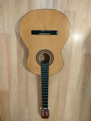 Guitarra española clásica de madera. - Cuerpo de madera clara. - Diapasón negro con trastes. - Cuerdas de nylon. - Clavijero metálico.