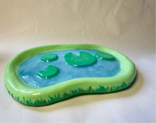 Mini bandeja decorativa inspirada en un pequeño estanque con nenúfares. Modelada y pintada completamente a mano, cuidando cada detalle. Ideal para colocar anillos, pendientes, pulseras o simplemente como objeto decorativo. • Material: arcilla blanca de secado al aire (Jovi) • Acabado: barniz brillante • Uso: exclusivamente decorativo • Pieza única Perfecta para dar un toque delicado y relajante a tu tocador, escritorio o mesilla. Tamaño aproximado: ver fotos en la mano para referencia • No mojar (el barniz no es resistente al agua) MI Se envía cuidadosamente protegida Al ser una pieza artesanal puede presentar pequeñas irregularidad