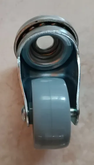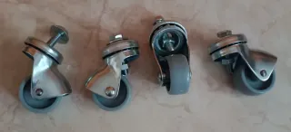 Juego de cuatro ruedas giratorias con tornillo para montaje. - Ruedas de goma gris. - Soporte metálico plateado. - Tornillo de fijación incluido. Medidas aproximadas: alto 5 cm, ancho rueda 3 cm, ancho (rueda+soporte) 5 cm. Hago envíos y entregas en algunas zonas de Madrid. El precio es por las 4 ruedas