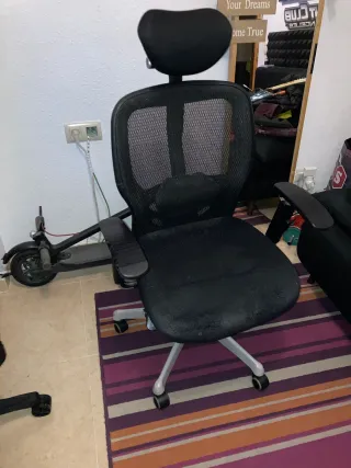 Silla de oficina con diseño ergonómico y reposacabezas. - Respaldo y asiento de malla transpirable. - Reposabrazos ajustables. - Base con ruedas para fácil movilidad.