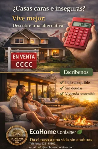 Solución de vivienda modular y sostenible. contenedores marítimos reciclados (20 o 40 pies) para crear viviendas modulares, sostenibles y rápidas de construir, con plazos un 60-75% más rápidos que la construcción tradicional. Son estructuras resistentes, duraderas y escalables, personalizables con alto aislamiento térmico y opciones de diseño moderno. Aspectos Clave de la Propuesta Modelos y Costos: Existen opciones desde contenedores individuales (aprox. 36 ) por unos 26.000 € hasta modelos más amplios ( , 105.000 €) que combinan varios módulos, ofreciendo soluciones asequibles y escalables. 623118802 Info@ecohomecontainer.com