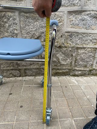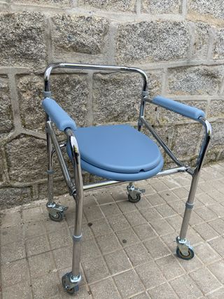 Silla de baño con asiento y reposabrazos acolchados. - Estructura de metal cromado. - Asiento de plástico azul. - Reposabrazos acolchados en azul. - Ruedas para facilitar el desplazamiento.