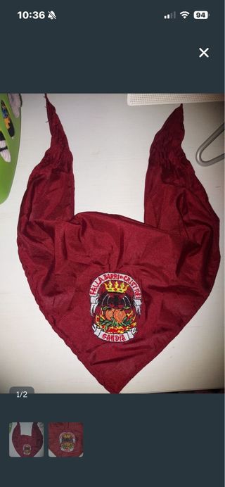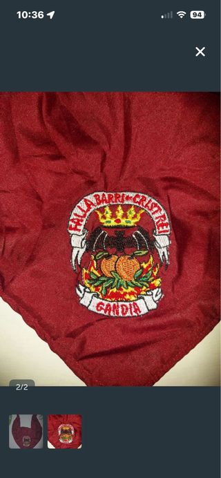 Pañuelo de tela de color granate con escudo bordado. - Escudo con corona, naranjas y texto Falla Barri Crist Rei Gandia. - Diseño triangular con puntas.