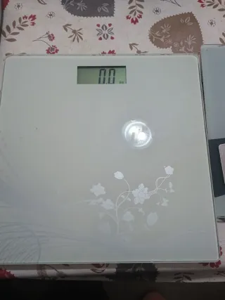 Báscula de baño con diseño moderno y elegante. - Pantalla digital de fácil lectura. - Indicador de peso en kg. - Superficie de cristal. - Decoración floral.