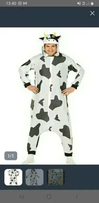Disfraz de vaca para adulto, tipo mono con capucha. - Diseño de vaca con manchas negras y blancas. - Cierre frontal con cremallera. - Capucha con detalles de cuernos y orejas de vaca. Talla-M queda 1 y T-L quedan 2 unidades