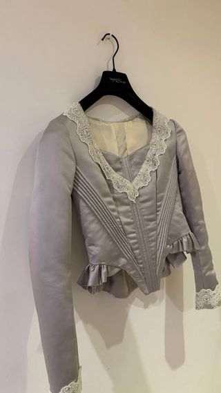 Elegante corpiño de satén plateado con detalles de encaje. - Diseño con escote en V. - Adornos de encaje en el escote y puños. - Volantes en la cintura - Talla S /M medidas manga 22 cm, contorno pecho 85-90 cm