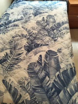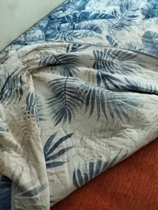 Colcha bouti con un diseño de hojas tropicales en tonos azules y blancos. Aporta un toque fresco y natural a tu habitación. - Estampado de hojas grandes y pequeñas. - Tejido acolchado. - Acabado suave al tacto.
