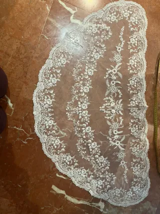 Mantilla de encaje en color crudo, ideal para niñas. Presenta un delicado diseño floral. - Medidas: 56 x 100 cm. - Color: Crudo.