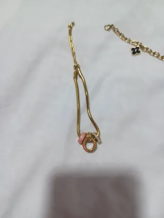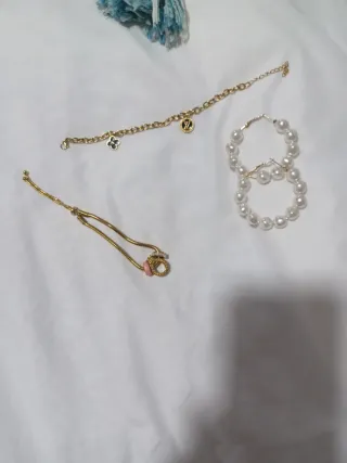 Conjunto de joyería de acero inoxidable. - Pulsera dorada con charms. - Gargantilla dorada con detalles. - Pendientes de perlas.