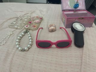 Conjunto de accesorios con temática de princesas Disney. - Caja de música decorada con princesas. - Funda para móvil transparente con diseño de lazos. - Funda para móvil con diseño de conchas y flores. - Gafas de sol rosas. - Mini ventilador portátil. - Funda para auriculares inalámbricos.