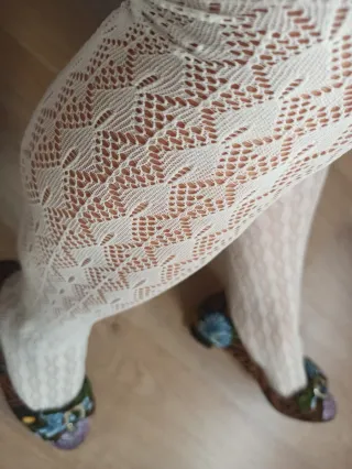 Medias altas de encaje blanco, perfectas para complementar tu traje y comodisima - Diseño de encaje intrincado. - Acabado con volantes de encaje en el borde. - Tejido elástico para un ajuste cómodo.