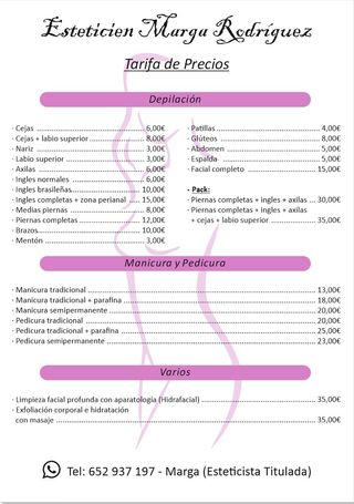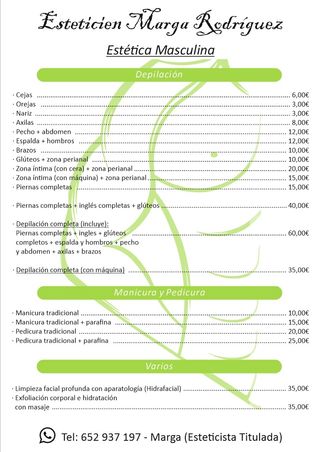 Esteticista Titulada, me ofrezco para Depilación Hombre y Mujer, Depilación, Manicura, Esmalte Permanente, Pedicura, Limpieza Facial, Exfoliación Corporal e Hidratación con masaje,...Los precios los que veis en las fotografías. Telf de contacto 652937197. Un saludo!!.