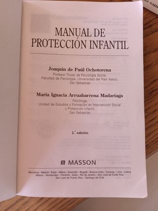 Manual de protección infantil, 2ª edición, de J. de Paúl Ochotorena y M. I. Arruabarrena Madariaga. Está en buen estado. -Autores: J. de Paúl Ochotorena y M. I. Arruabarrena Madariaga -Editorial: Masson -Edición: 2ª edición Solo envíos a Canarias.