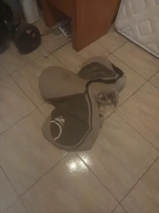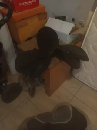 Silla de montar de equitación. - Diseño en tonos beige y marrón. - Detalle de logo en blanco.se falta una extrivera izquierda.