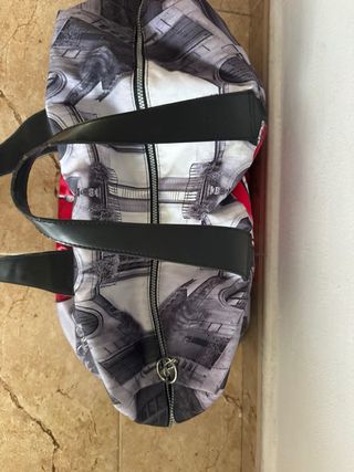 Bolsa de viaje con un llamativo diseño de un coche Volkswagen rojo sobre un fondo urbano en blanco y negro. Las asas son de simil cuero negro. Nunca usada pero el tirador de la cremallera se rompió y lleva uno probisonal - Diseño frontal de coche clásico. - Estampado de calle en los laterales. - Asas de cuero negro.