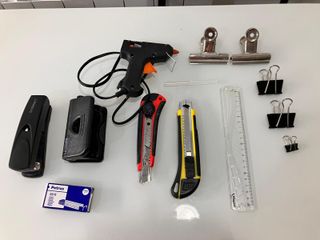 VENTA POR MUDANZA Lote de artículos de papelería y librería, ideal para oficina o estudio. - Grapadora Q-Connect negra. - Cúter con cuchilla retráctil (2 unidades). - Pistola de silicona con barras. - Regla de plástico transparente. - Caja de grapas Petrus 22/6. - Pinzas de metal (2 grandes y 3 pequeñas).