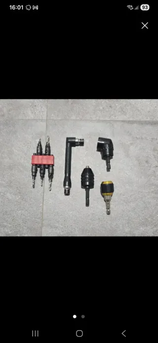 Conjunto de accesorios para herramientas eléctricas. - Brocas avellanadoras con tope de profundidad. - Adaptador de ángulo para taladro. - Portabrocas. - Extensión flexible para taladro.
