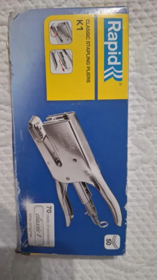 Vendo 3 tenazas grapadoras Rapid Classic K1, de sobremesa, cromadas y de metal, resistentes y de calidad profesional. Ideales para oficina, despacho o uso doméstico. Características: • Capacidad: hasta 50 hojas • Yunque ajustable para diferentes tipos de grapado • Cuerpo metálico cromado, muy duradero • Diseño clásico y profesional tengo 3 (20 euros cada una)