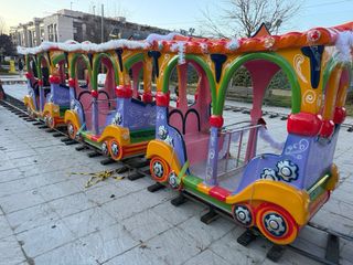 Tren infantil de atracción de feria, ideal para eventos o parques. - Vías incluidas. - Diseño colorido y festivo. Se vende tren infantil de vía atracción de feria Se compone por tres vagones y locomotora Caben niños y padres y en la parte trasera una silla para bebés iluminación LED  máquina para el funcionamiento con dos posiciones de velocidad incluye música las vías son de encaje y se puede hacer desde 8 m hasta 30