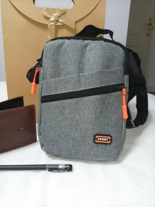 Conjunto de accesorios para hombre, ideal para regalar en ocasiones especiales. - Bolso bandolera gris con 3 bolsillos con cremalleras negras. - Cartera billetera azul marino de polipiel para tarjetas monedero con cremallera. - Bolígrafo negro de tinta gel con detalles plateados. - Se envía con su bolsa de regalo.