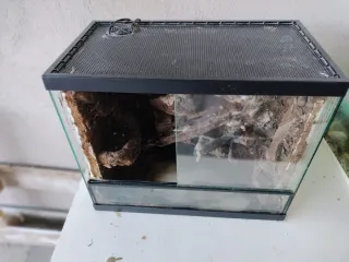 Terrario de cristal con diseño de roca y sustrato. - Puertas frontales deslizantes. - Rejilla superior para ventilación. - Ideal para reptiles o anfibios. Medidas: Largo 50 cm Ancho 41 cm Fondo 28 cm