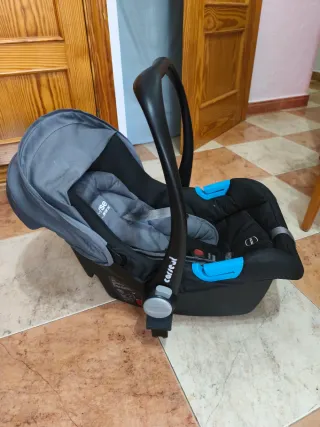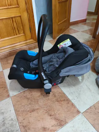 Silla de coche para bebé, ideal para transportar a los más pequeños de forma segura. - Diseño ergonómico. - Incluye capota. - Color gris y negro con detalles azules.