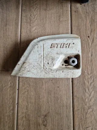 Tapa de plástico para motosierra Stihl MS241. Presenta marcas de uso . - Logo de Stihl visible.