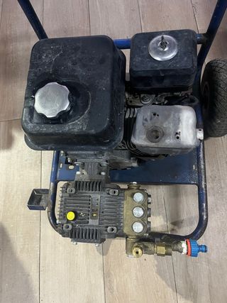 Máquina chorro de arena hidrolimpiadora arenadora chorreadora maquina de agua a presion con motor de gasolina. Vanguard 18 hp arranque automático bomba 300 bares 18 lm 1450 rpm 21.5 lm 1740 rpm bomba HAWK 6 lanzas diferentes un alargador boquillas diferentes chorros . Para limpieza de superficies maquinaria ect muy potente 2 mangueras con enganche rapido . Solo ha trabajado en 3 ocasiones. Filtros y aceites cambiados del motor de la bomba y del reductor Este equipo fue construido desde cero por una empresa especializada.