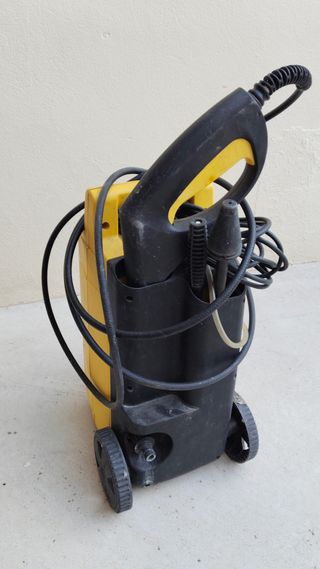 Hidrolimpiadora Karcher K2.90 de color amarillo. - Diseño compacto y portátil. - Ruedas para facilitar el transporte. - Manguera y cable de alimentación incluidos. Funciona pero al cabo de un rato empieza a vibrar y produce menos presión. Se puede utilizar tal cual para limpiar coche, moto, bici, etc. pero para limpiar a presión suelos y paredes le falta presión. Se puede reparar pero no me da tiempo hacerlo. Sirve pues para trabajos sencillos o para recambios de pistola, manguera, etc.