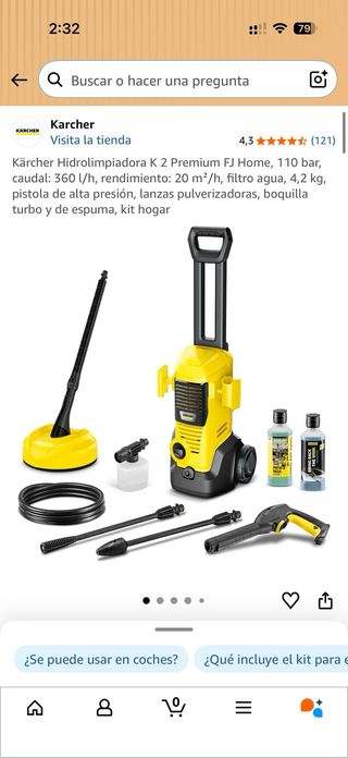 Hidrolimpiadora Karcher K3 en posición horizontal. Usada poquísimo, 3 o 4 veces. - Incluye accesorios y filtro que compré aparte. -También incluye accesorio para suelo. - Manguera de alta presión.