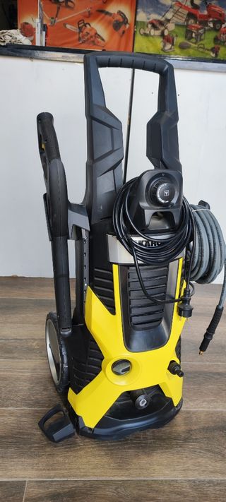 Hidrolimpiadora Karcher K7 en color negro y amarillo. Ideal para limpieza exterior. - Manguera de alta presión enrollada. - Pistola con lanza. - Ruedas para facilitar el transporte. Tiene 2o 3 usos maximo con garantía y factura