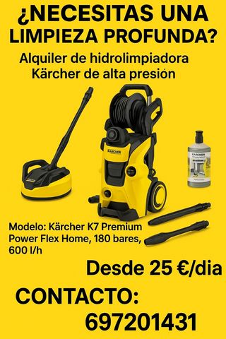 ¿Necesitas una limpieza profunda para tu hogar, jardín o vehículo? 🫧🏡🚗 Ofrecemos el alquiler de hidrolimpiadoras Kärcher de alta presión, ideales para eliminar suciedad incrustada en diversas superficies. Modelo Disponible: -Kärcher K7 Premium Power Flex Home: 180 bares, 600 l/h. Tarifas: -Desde 25 €/día 💵 -Descuentos por alquileres de varios días. -1 litro de detergente por 5 €. 🧼 -Alquiler de kit para el hogar por 10 € adicionales. -Fianza reembolsable de 50 €. Servicios Adicionales: -Entrega y recogida a domicilio. -Asesoramiento personalizado según tus necesidades. Contacto: 📞 697201431