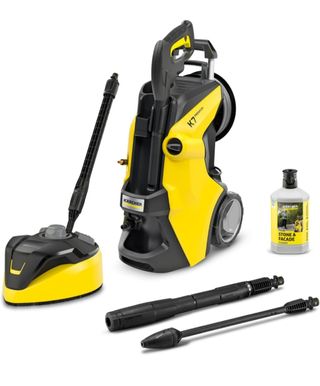 Hidrolimpiadora Karcher K7 Premium en color amarillo y negro. Incluye accesorios. - Diseño con ruedas para fácil transporte. - Depósito para detergente. - Manguera de alta presión.