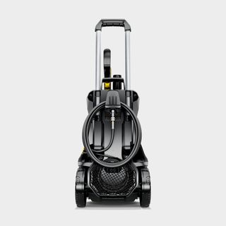 Hidrolimpiadora Karcher K7 Premium en color amarillo y negro. Incluye accesorios. - Diseño vertical con ruedas. - Mango telescópico. - Manguera enrollada en la parte trasera.