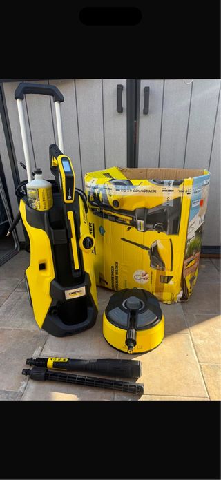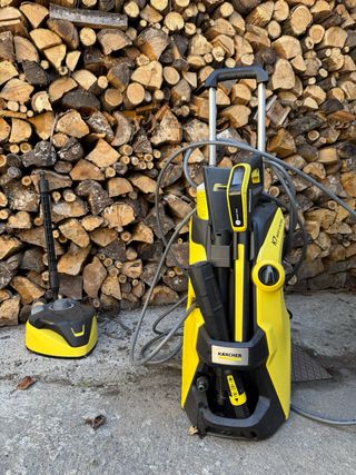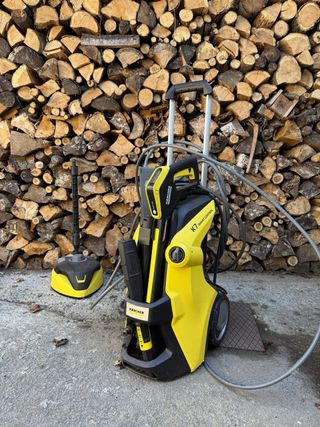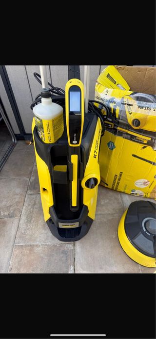 Hidrolimpiadora Kärcher K7 Smart Control de alta presión. Incluye accesorios Ecobooster y para limpiar el suelo. Está en PERFECTO ESTADO, apenas se ha utilizado. - Color amarillo y negro. - Diseño con ruedas para fácil transporte. - Manguera de alta presión enrollada.