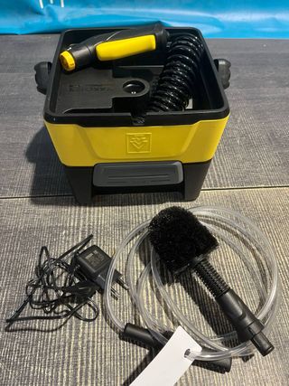 Hidrolimpiadora Kärcher OC 3 Adventure Box, baja presión, caudal: 2 l/h, peso: 2,2 kg, depósito de 4 l, manguera espiral: 2,8 m, boquilla de chorro plano, manguera de aspiración, cepillo universal. 4054278636313 No tiene tapa superior, todos los componentes están en la foto.