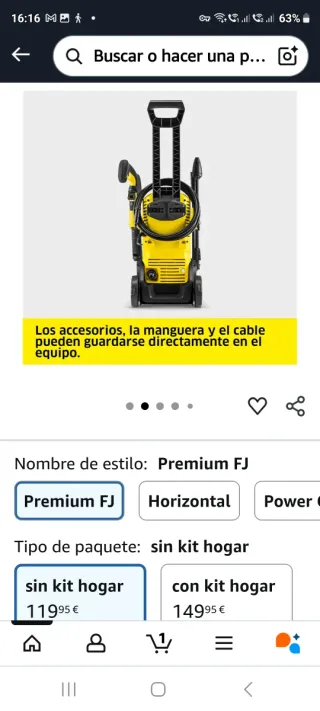 Hidrolimpiadora Kärcher K 2 Premium FJ en color amarillo y negro. Los accesorios, la manguera y el cable se guardan directamente en el equipo. Tiene partido un trozo de la parte trasera de la pistola que se puede sellar con cinta, [hay foto]no la llegué a estrenar , ccompré otra y he perdido el plazo de devolución. La vendo en menos de la mitad - Presión: 110 Bar. - Estilo: Premium FJ. - Tipo de paquete: Sin kit hogar.