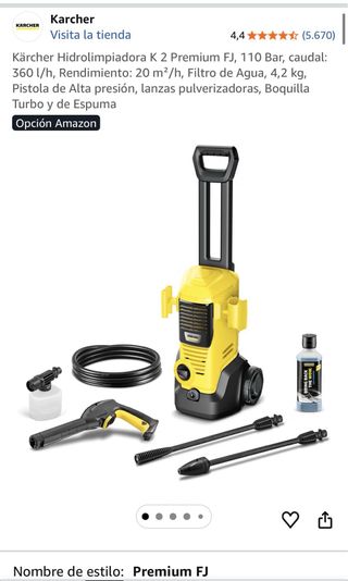 Hidrolimpiadora Kärcher K 2 Premium FJ en color amarillo y negro. Nueva a estrenar - Presión de 110 Bar. - Caudal de 360 l/h. - Rendimiento de 20 m²/h. - Incluye filtro de agua. - Peso de 4,2 kg. - Pistola de alta presión. - Lanzas pulverizadoras. - Boquilla Turbo y de Espuma.