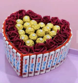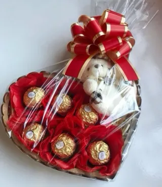 Preciosa cesta en forma de corazón, ideal para regalar en San Valentín. Contiene chocolates Ferrero Rocher y un tierno peluche. - Chocolates Ferrero Rocher envueltos en papel dorado. - Peluche blanco con detalles a cuadros. - Decoración interior en papel rojo. - Lazos rojos y dorados para el cierre. Precios según la cestas
