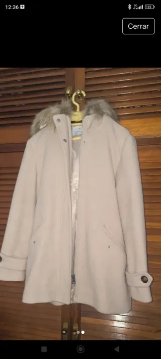 Abrigo de paño en color beige de la marca Stradivarius. - Talla M. - Diseño con capucha y pelo. - Cierre de cremallera.