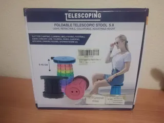 Taburete telescópico plegable y ajustable en altura. Ideal para exteriores y eventos. - Ligero y fácil de transportar. - Altura ajustable de 6 a 45 cm. - Apto para camping, conciertos, jardines y más. - Incluye funda. - Fabricado en China.