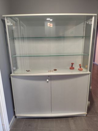 Vendo 4 vitrinas expositora de cristal con estructura metálica y mueble inferior de dos puertas y 3 camillas para masajes, una de ellas con motor de subida y bajada. - Estantes de cristal. - Puertas con tirador. - Diseño moderno y funcional.